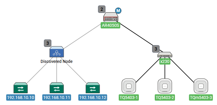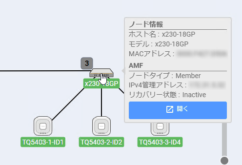 AMFゲストノードとしても認識されている管理下のAPは、実際の接続先であるAMFノードにつながった形で表示されます。