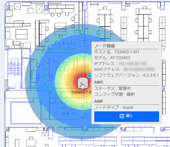 画面中央には管理下APの位置と電波の想定到達範囲を示すヒートマップが表示されます。