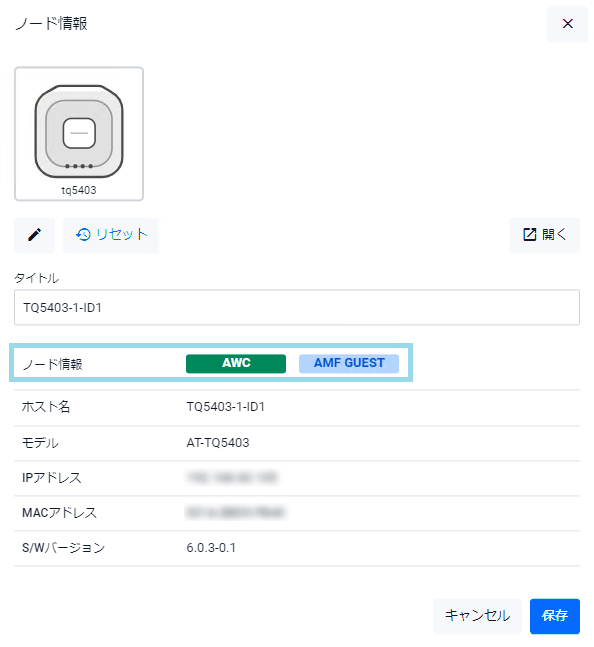 無線LANコントローラーの管理下にある場合はAMFゲストノードかどうかにかかわらず「AWC」と表示され、無線LANコントローラーの管理下にないAMFゲストノードの場合は「Guest」と表示されます。
