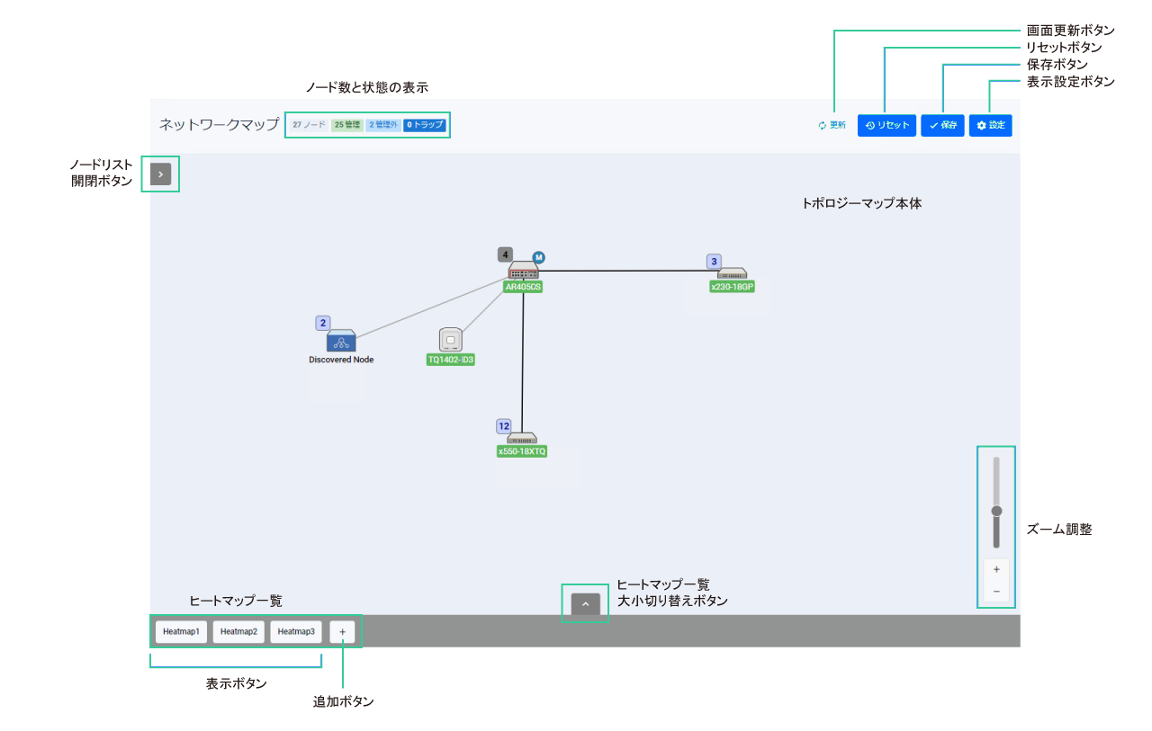 画面上部にはトポロジーマップ上に表示されているノード数と状態が表示されます。