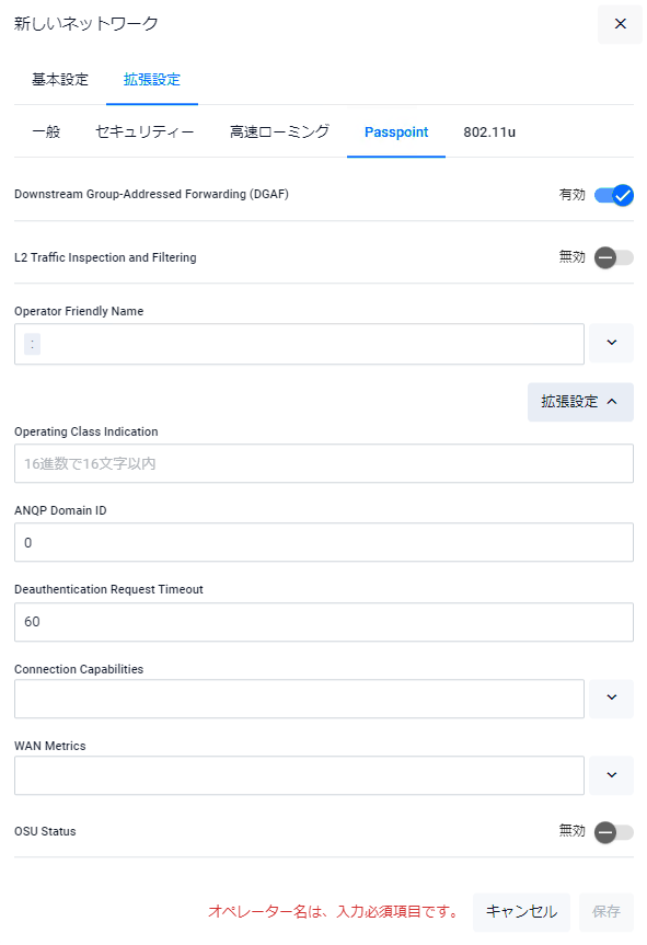 | Passpoint | Passpointの有効/無効を選択します。有効にすると「新しいネットワーク - 拡張設定」ダイアログにPasspointタブ、802.11uタブが表示され、Passpointの設定を行えます |