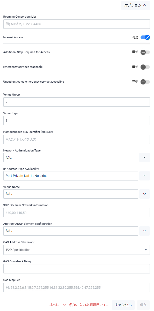 | 説明(オプション) | 対象無線ネットワーク設定に説明文を指定します。256文字以内。半角英数字と記号( ! # $ % & ' ( ) * + , - . / : ; < = > @ [ \ ] ^ _ ` { | } ~ )を使用可能です |