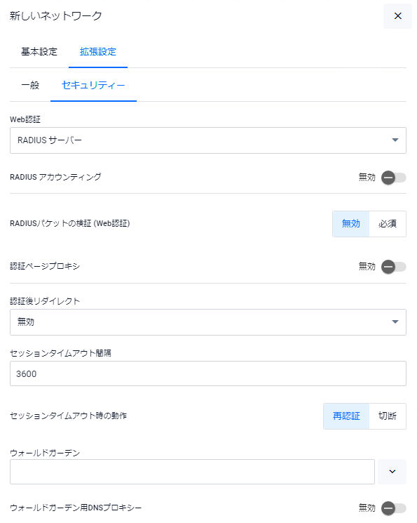 | RADIUS 認証グループ | 認証用RADIUSサーバーグループを選択します。デフォルトは「無効」です。 |
