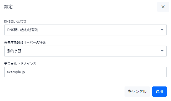 | 適用ボタン | DNSサーバーへの問い合わせの設定を保存して一覧画面に戻ります |