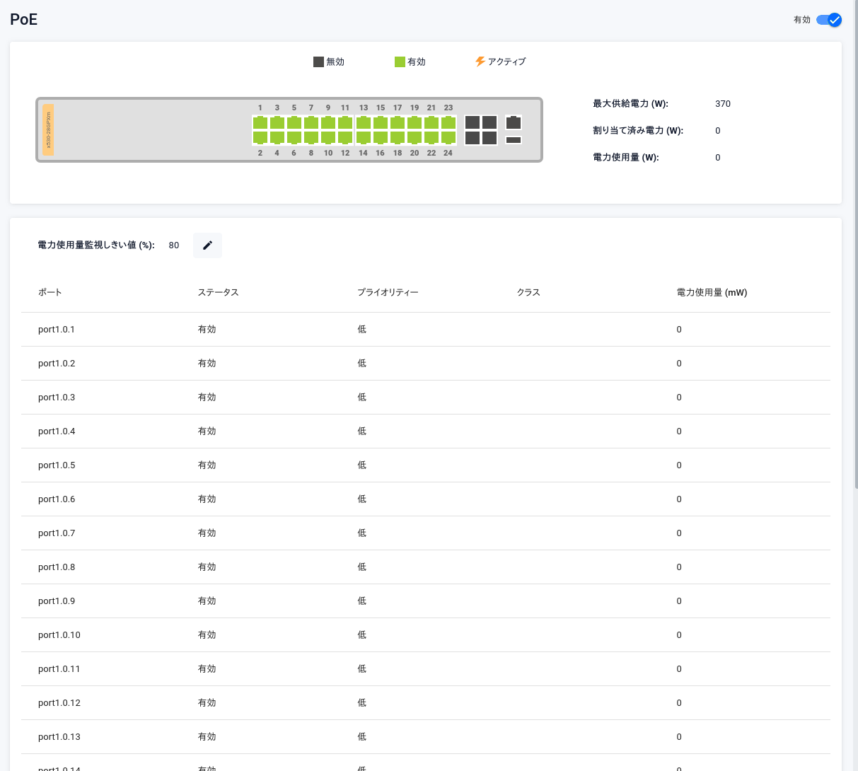 | 無効・有効スライドボタン | システム全体でPoE給電機能の無効・有効を切り替えます |