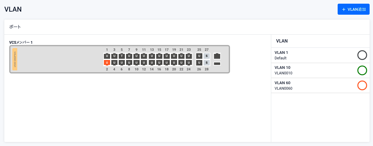 | ポート | 各スイッチポートのタグ設定と所属VLANが視覚的に表示されます。 ・無色U - 初期設定ポート(明示的なVLAN設定のない、vlan1所属のタグなしポート) ・U - タグなしポート(アクセスポート) ・T - タグ付きポート(トランクポート) 各ポートの所属VLANは、該当ポートにマウスカーソルを当てると表示されるポップアップによって確認できます。 また、タグなしポートでは所属VLANが「VLAN」一覧の色でも示されます。 一方タグ付きポートは、「VLAN」一覧で選択中のVLANに所属していれば背景色が該当VLANの色になり、そうでなければ背景色が濃い灰色になります。 ポートをクリックまたはマウスカーソルを当てることで該当ポートのタグ設定と所属VLANの変更およびネイティブVLANの設定をすることもできます。詳細は「タグ設定・所属VLANの変更・ネイティブVLANの設定」をご覧ください |