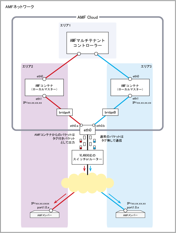 NoteMicrosoft AzureのVPN機能を使用する構成では、AMFコンテナとAMF Cloudの外部接続用インターフェース間でのブリッジングやVLANタグの使用は未サポートです。同構成でもコンテナの外部接続にブリッジインターフェース(brX)を使用しますが、brX を L3インターフェースとして使用するルーティング構成になります。詳しくは「AzureのVPN機能を利用する設定」をご覧ください。