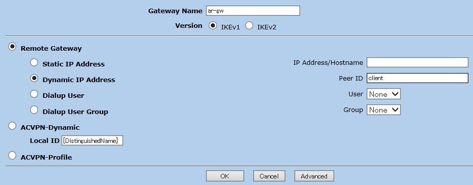 [Remote Gateway]-[Dynamic IP Address] を選択し、[Peer ID]に「client」を入力