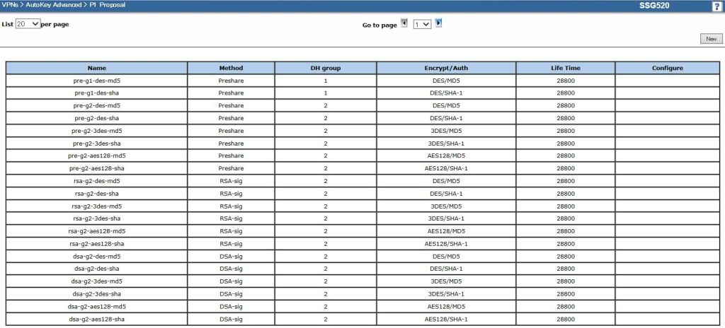 画面左のメニューから[VPNs]-[Autokey Advanced]-[P1 Proposal]を選択して、P1 Proposalリスト画面が表示されたら、画面右上の[New]をクリックします。