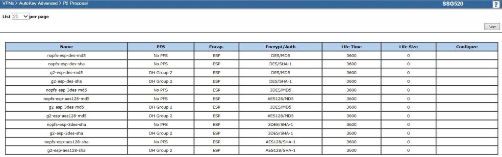 画面左のメニューから[VPNs]-[Autokey Advanced]-[P2 Proposal]を選択して、P2 Proposalリスト画面が表示されたら、画面右上の [New]をクリックします。
