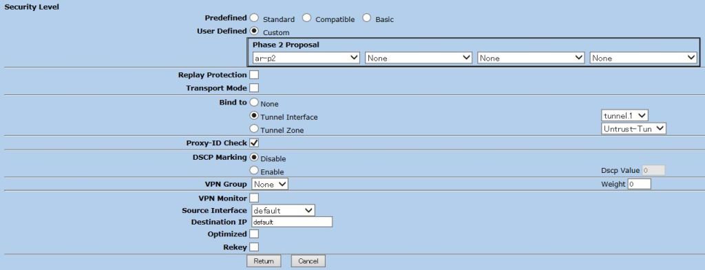 [Security Level]で「Custom」を選択し、[Phase 2 Proposal]で「ar-p2」のみを選択、他の3つは「None」