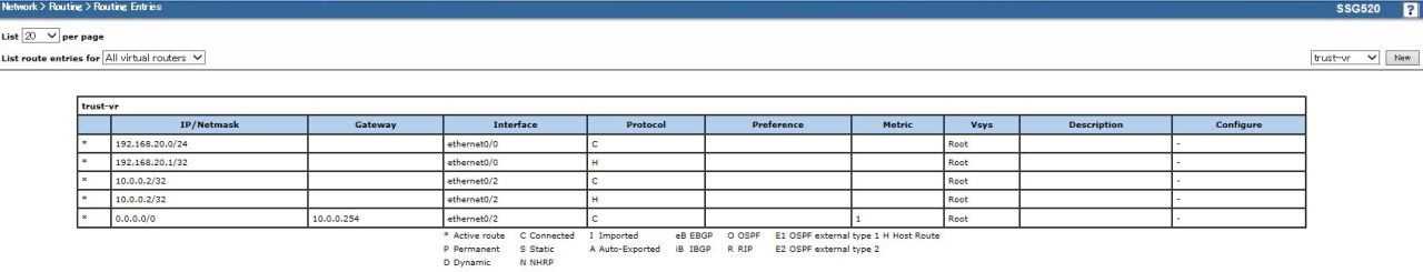 画面左のメニューから[Network]-[Routing]-[Destination]を選択して、Routing Entries画面が表示されたら、画面右上の リストから[trust-vr]を選択して[New]をクリックします。