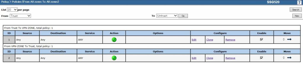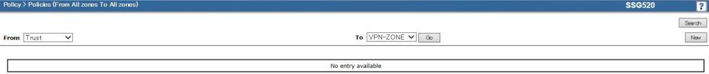 まず、LAN→IPsecトンネル方向の設定を行うため、以下のようにFrom/ToのZoneを選択して[New]をクリックします。