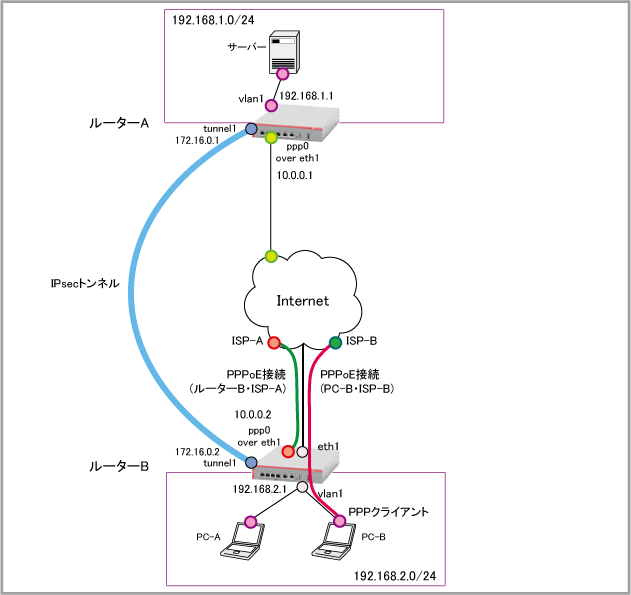 | WAN側(ppp0)IPアドレス | 10.0.0.1/32 | 10.0.0.2/32 |