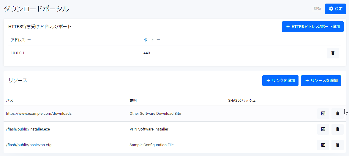 | 設定ボタン | ダウンロードポータルの有効・無効を切り替えます。切り替え前には確認のダイアログが表示されます |