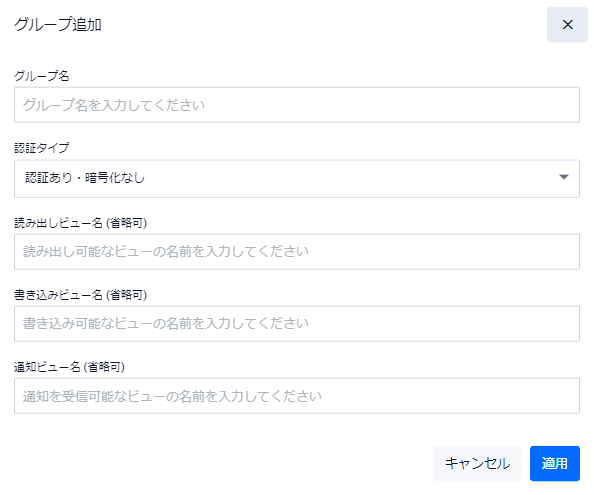 | 認証タイプ | グループ所属ユーザーに求められる最低限のセキュリティーレベルを「認証あり・暗号化なし」、「認証なし・暗号化なし」、「認証あり・暗号化あり」から選択してください |