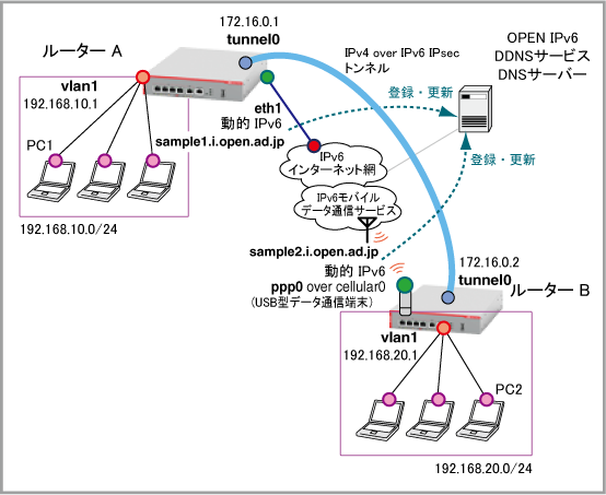 本設定例では、ソフトイーサ社が提供する「OPEN IPv6 ダイナミック DNS for フレッツ・光ネクスト」サービスを利用して、IPv6インターネット網およびIPv6モバイルデータ通信サービス網間のIPv6通信でIPv4 over IPv6 IPsec VPNを構築し、拠点間をレイヤー3で接続する手順を説明します。
