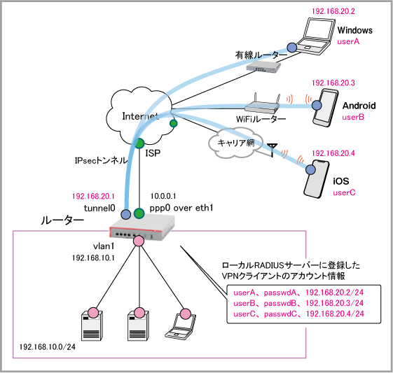 | ユーザーA | userA | passwdA | 192.168.20.2/24 |