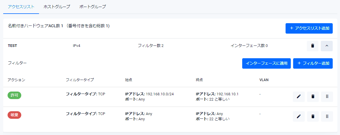 | IPバージョン | アクセスリストのIPバージョンがIPv4またはIPv6で表示されます |
