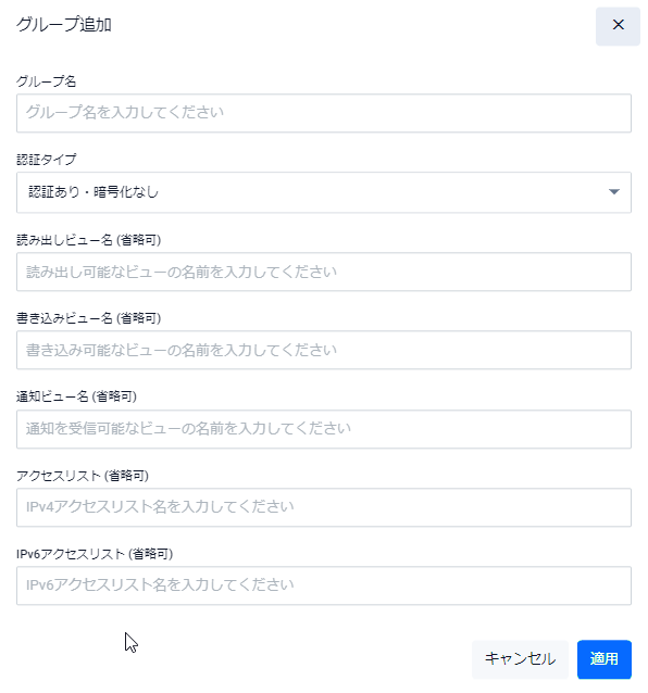 | グループ名 | 追加するグループ名を入力してください。1~20文字。半角英数字と記号( ! # $ % & ' ( ) * + , - . / : ; < = > @ [ \ ] ^ _ ` { | } ~ )が使用可能です |