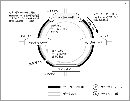 Noteマスターノードがダウンしている場合やエンハンストリカバリーに対応していない場合、他にも障害箇所があってマスターノードと通信できない場合などは、PLFメッセージを受信できませんが、その場合はマスターノード不在、すなわち、リングが完全でない(ループしていない)とみなし、一定時間後にプリフォワーディングからフォワーディング状態に遷移し、ポートのブロッキングを解除します。