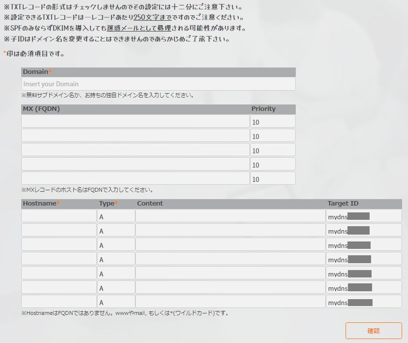 - 「DOMAIN INFO」をクリックし、入力したホスト名に子TargetIDを割り当て、「確認」をクリックします。