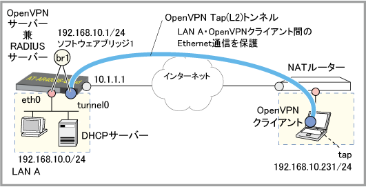 NoteAndroid版およびiOS版クライアントではTap(L2)モードでのOpenVPN接続が未サポートのため、本構成は使用できません。