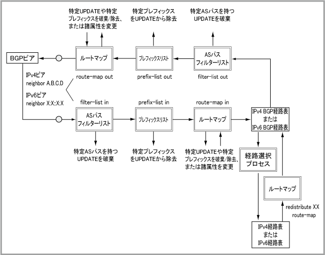 ASパスフィルターリストなどと同じように、UPDATEメッセージの受信時に特定の経路を受け入れないよう設定したり、UPDATEメッセージの送信時に特定の経路を通知しないように設定したりできるほか、受信した経路の属性を変更してから受け入れたり、経路の属性を変更してから送信したりすることもできます。