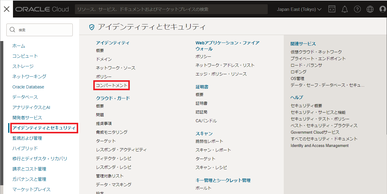 左のメニュータブから「アイデンティティとセキュリティ」>「コンパートメント」を選択します。