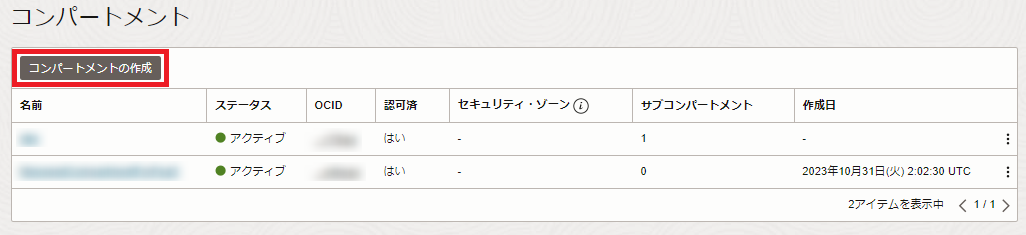 「名前」と「説明」を入力し、「コンパートメントの作成」ボタンをクリックします。