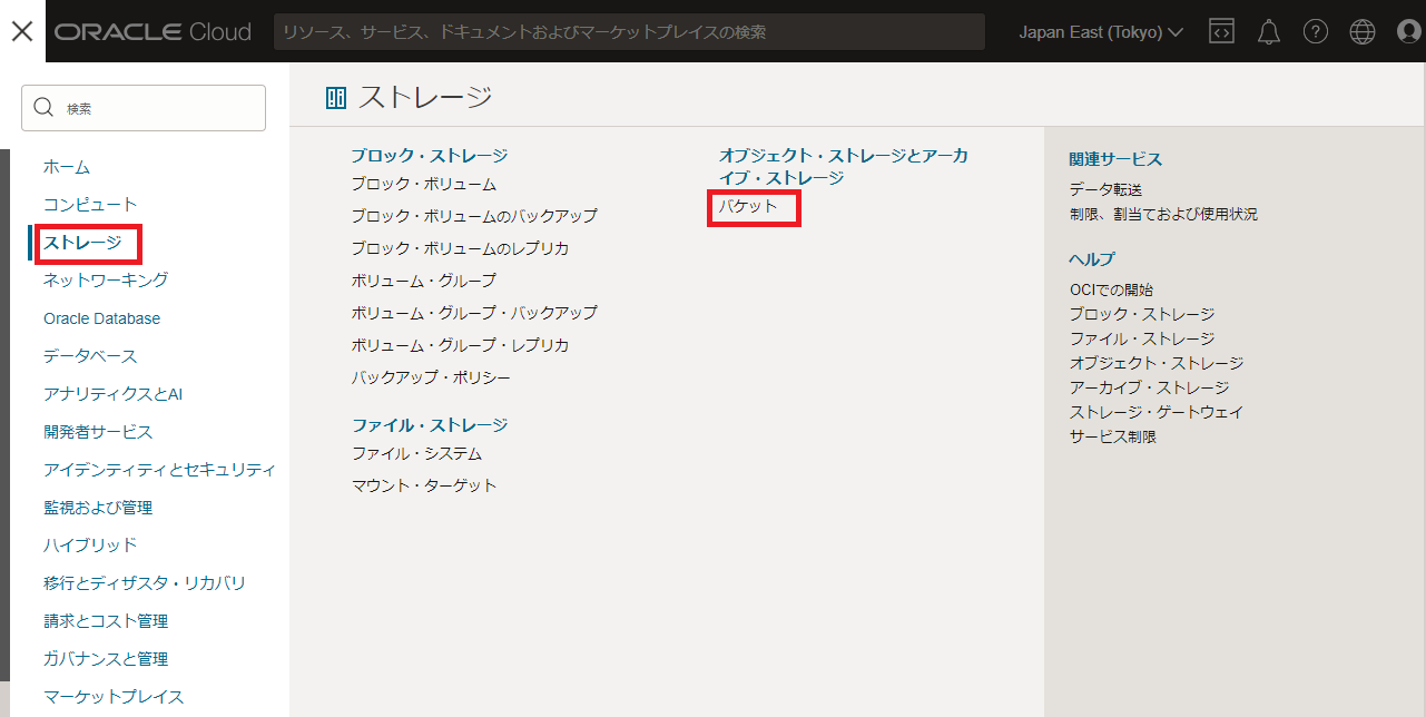 左のメニュータブから「ストレージ」>「バケット」を選択します。