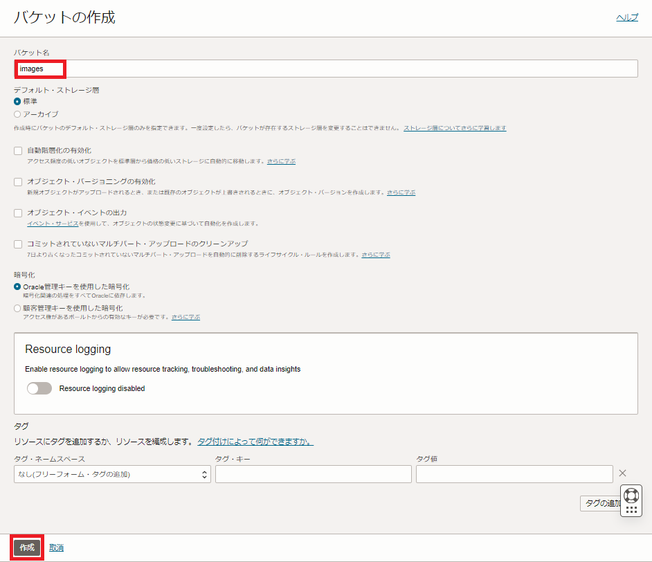 「バケット名」を入力して「作成」ボタンをクリックします。