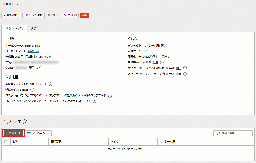 左メニューの「コンパートメント」から事前に用意したコンパートメント を選択し、「バケットの作成」ボタンをクリックします。