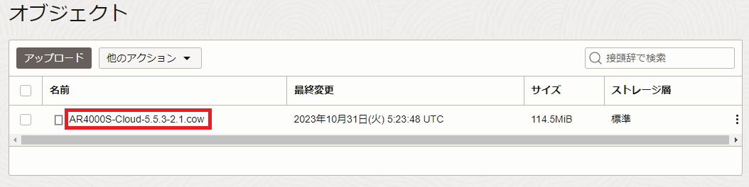 「コンピュータからファイルを選択」欄に本製品のCDに収録されているOracle Cloud用のCOWイメージファイル(拡張子「.cow」のファイル)をドラッグ&ドロップし、表示されたイメージファイル名を選択して「アップロード」ボタンをクリックします。