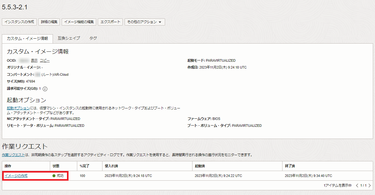 作業リクエスト欄の「イメージの作成」が成功していることを確認します。