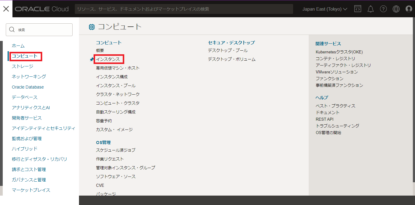 左のメニュータブから「コンピュート」>「インスタンス」を選択します。