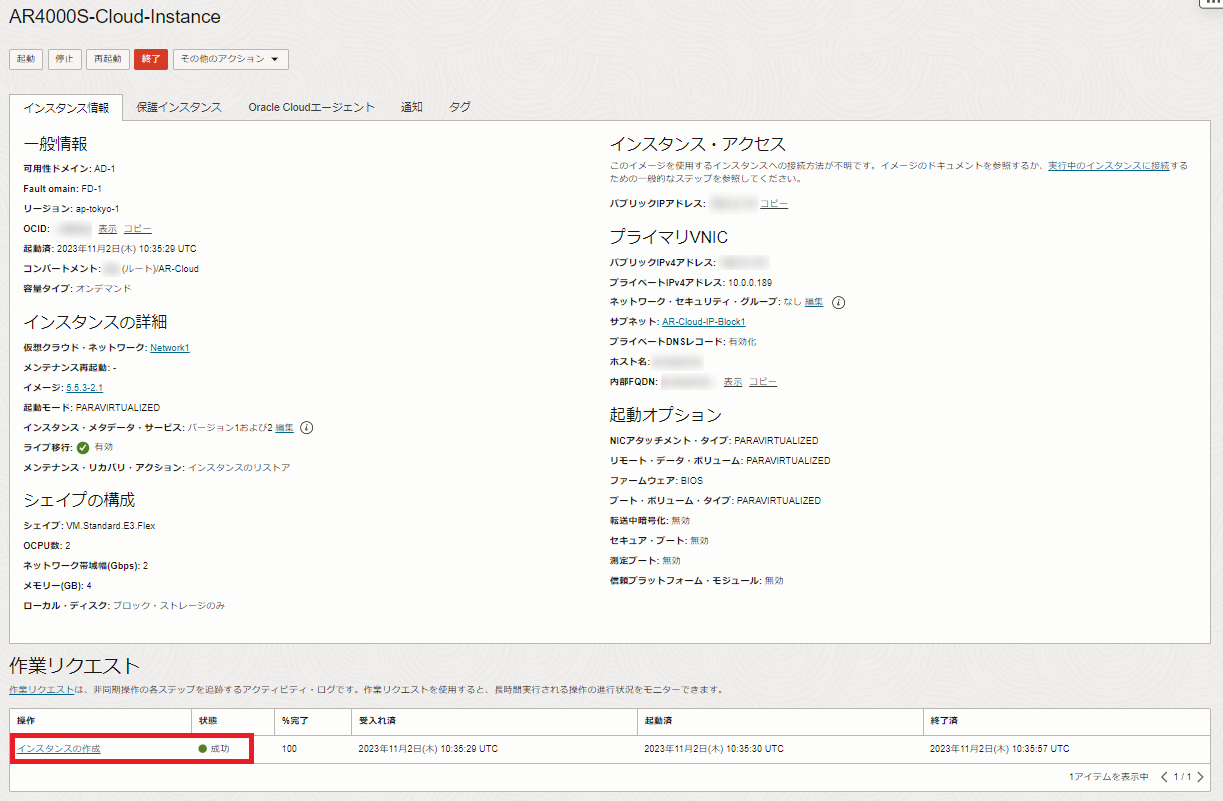 作業リクエスト欄の「インスタンスの作成」が成功していることを確認します。
