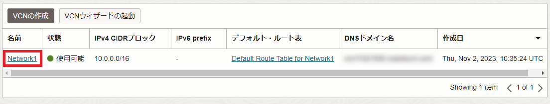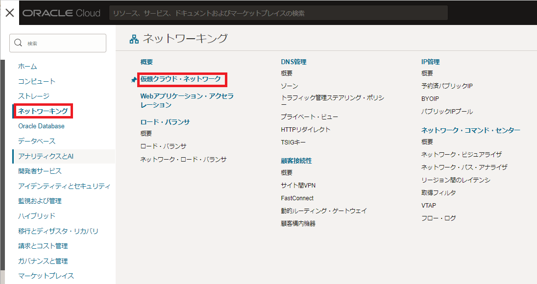 左のメニュータブから「ネットワーキング」>「仮想クラウド・ネットワーク」を選択します。