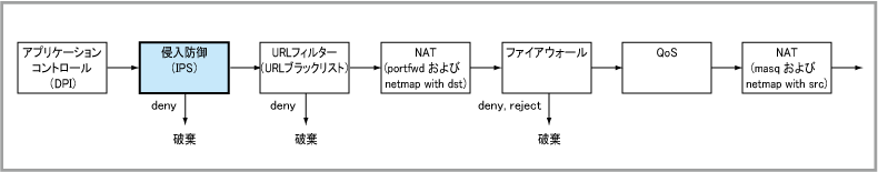 侵入防御(IPS)機能の処理は、ブリッジング用、ルーティング用の両インターフェースで受信したパケットに対して行われます。