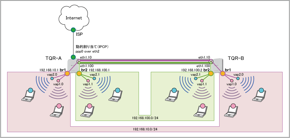 Note本設定例では、2.4GHzと5GHzの同一番号のVAPをブリッジに所属させ同じセグメントで運用しています。