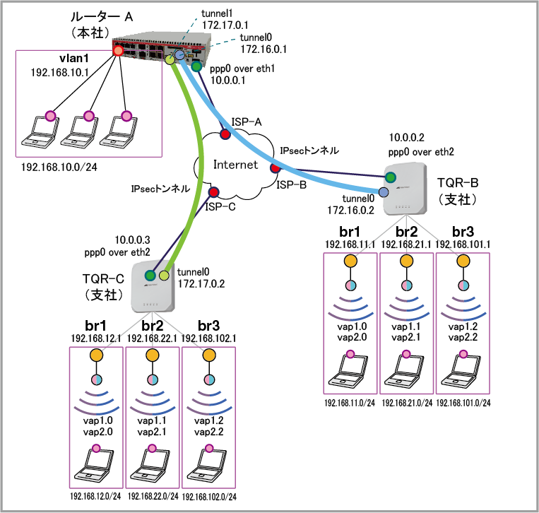 | LAN側(br1)IPアドレス | - | 192.168.11.1/24 | 192.168.12.1/24 |