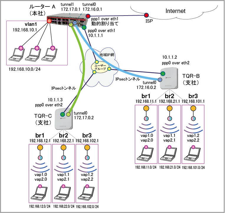 | WAN側(ppp0)IPアドレス | 10.1.1.1/32 | 10.1.1.2/32 | 10.1.1.3/32 |