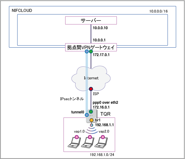 本例では本製品のLAN側サブネットとNIFCLOUDの仮想サブネットをL3VPN接続してIPトラフィックをルーティングします。