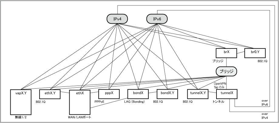これらのインターフェースにはIPv4/IPv6アドレスを設定してIPv4/IPv6パケットをルーティングすることができます。