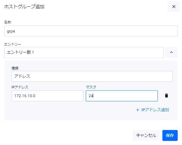 | エントリー | 右側の下向き矢印をクリックすることでホストグループのエントリー一覧、およびエントリー入力欄を追加するための「IPアドレス追加」ボタンが表示されます |