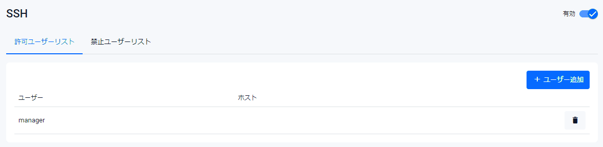 | 禁止ユーザーリストタブ | SSHサーバーへのログインを禁止するユーザーの一覧・設定をします |
