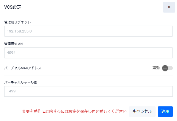 | 管理用サブネット | VCS機能が内部的に使用するVCS管理用サブネットのネットワークIPアドレスを入力してください。サブネットマスクは27ビット(255.255.255.224)固定のため指定する必要はありません |