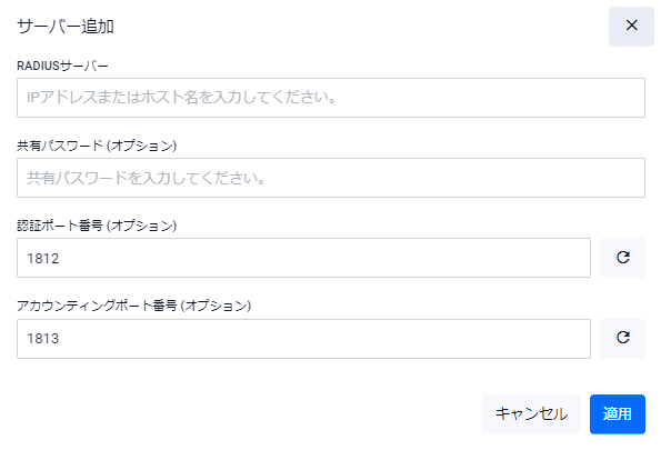 | RADIUSサーバー | RADIUSサーバーのIPアドレスまたはホスト名を入力してください |