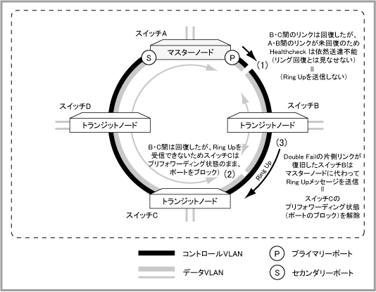 Noteマスターノードがダウンしている場合やエンハンストリカバリーに対応していない場合、他にも障害箇所があってマスターノードと通信できない場合などは、PLFメッセージを受信できませんが、その場合はマスターノード不在、すなわち、リングが完全でない(ループしていない)とみなし、一定時間後にプリフォワーディングからフォワーディング状態に遷移し、ポートのブロッキングを解除します。
