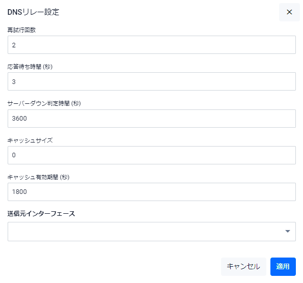 | 送信元インターフェース | DNSサーバーへの問い合わせ時に送信元とするインターフェースが表示されます |